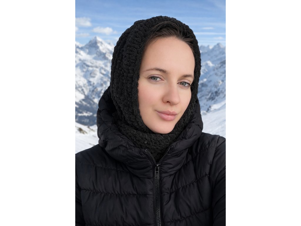 Kapuce se šálou v jednom s obvodem hlavy do 58 cm. Velikost M